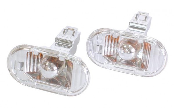 | クリアレンズのサイドマーカー(フェンダーマーカー)ランプでAssyで交換します。ノーレンズカットタイプ(ユーロタイプ)はアウターレンズはレンズカットがなく、電球を被うようにインナーレンズがあります。インナーレンズはハーフメッキコーティングしていますので通常はクロームに見え、ウインカーが点滅した時はオレンジの光が見えます。 |