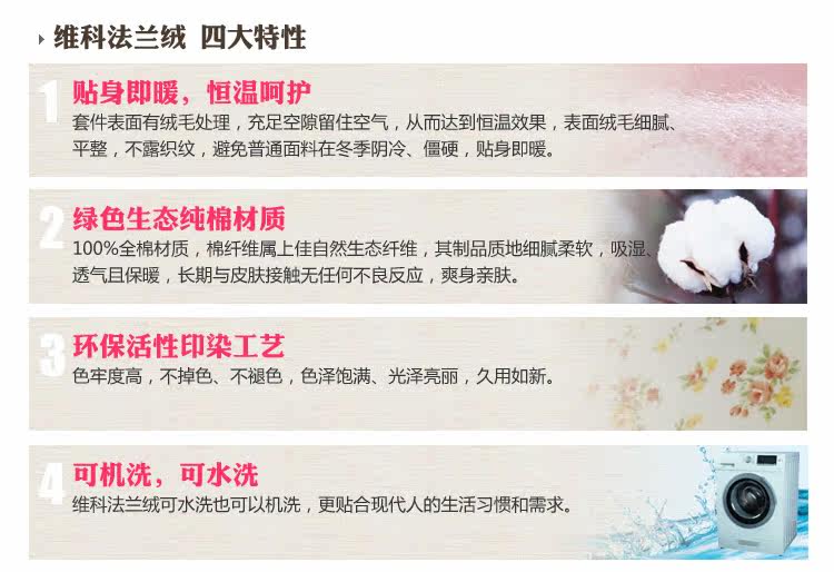 | 产品洗涤说明 | 水洗最高水温30度;不可氯漂;可干洗;中温熨烫;请勿接触锐器或用力撕拉 (深色要分开洗涤) 1、不要用洗涤剂长时间同其他产品一同侵泡,以免粘色; 2、洗涤时不宜使用含强氯化剂成分较多的洗涤剂; 3、充分洗净,以避免洗涤剂残留导致绒毛发硬; 4、漂洗时,加入棉柔顺剂,可更好的保持产品的舒软舒适。 |