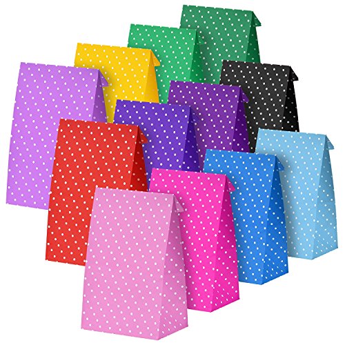 Delicate paper party bags: With delicate white dot design and diversified colors, these beautiful small paper bags can be widely applied for grocery, lunch, shopping, Christmas, holidays, graduations, wedding, birthdays, etc. Useful storage bags: You can use these bags to store some small items such as nuts, cookies, chocolates chips, candies, snacks, small toys and more. Specification: Color: 8 colors, assorted colors Material: 80 gsm craft paper Holding capacity: about 10 lb Size: approx. 22 x 12 x 8 cm/ 8.66 x 4.72 x 3.15 inch (when the bags are opened) Package includes: 24 x Party dot paper bags (3 pieces per color) 0