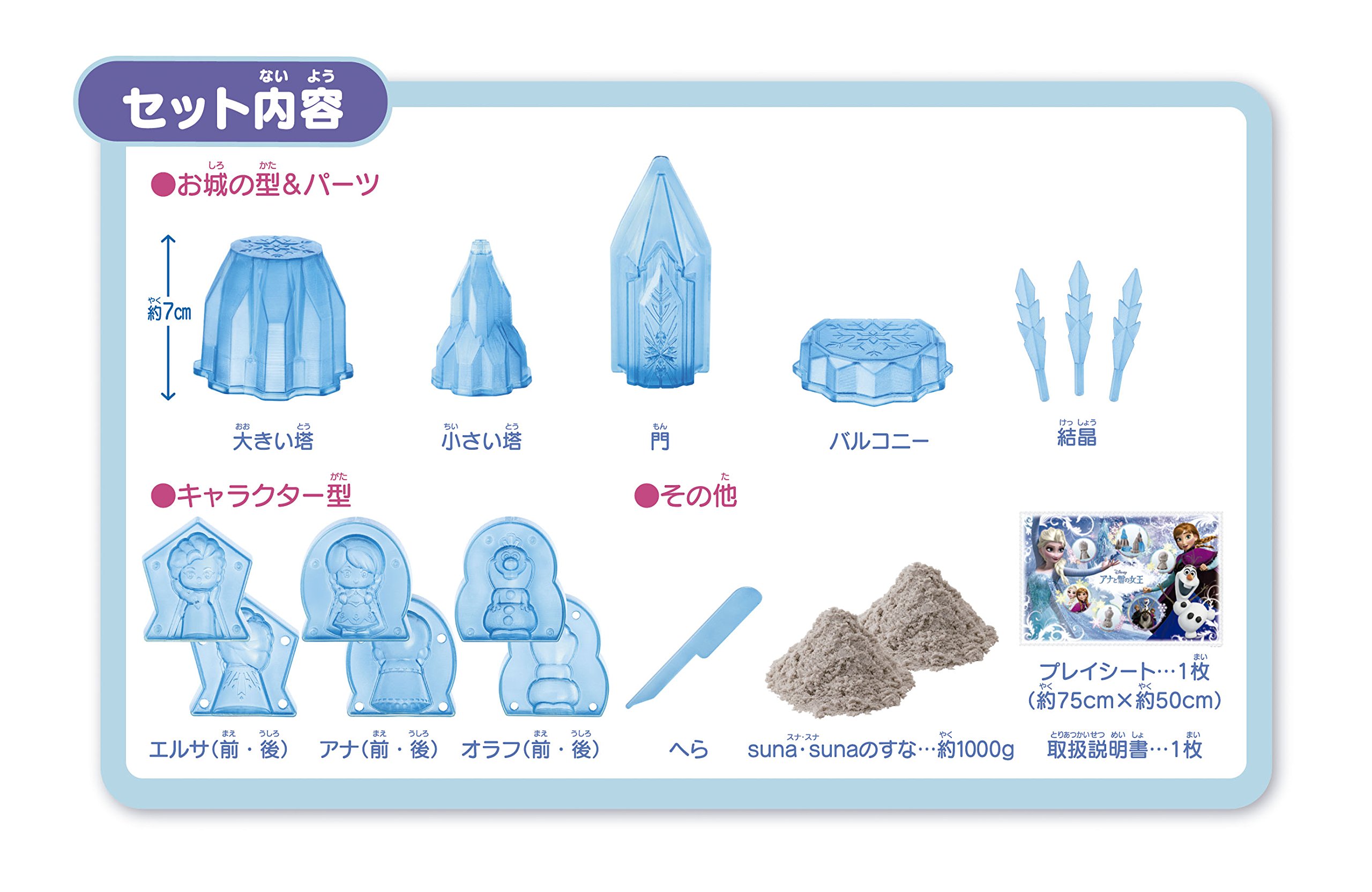 Each item 1 (roof, tower, balcony) that can make castle 1 each, sand of suna · suna (1 kg), spatula, play sheet, sand figure type (Ana, Elsa, Olaf)