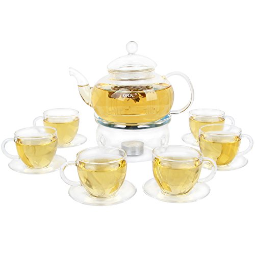 -. Feature : This beautiful tea set comes with a 27 oz teapot with a removable filter cup, a teapot warmer, and 6 units tea cups. / All pieces are made entirely of heat resistant borosilicate glass. Good for hot, iced tea, coffee (bag cofee) brew; Elegant and modern design. / The roomy removable filter allows tealeaves to expand and provide full infusion of the leaves. / It is easy to brew loose tea. Just put the tea into the inner cup and add some water, then the inner cup releases infused tea directly into the outside teapot. / The tea warmer cozy can fit most teapots. 6 beautiful cups have double layers having good thermal insulation. PLEASE NOTE the wooden tray shown in the pictures is not included in the package.