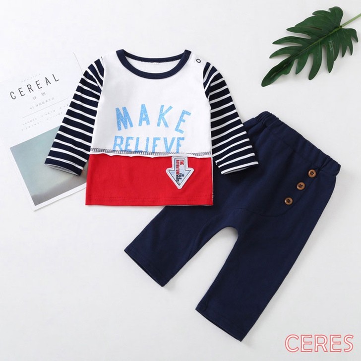 【製品仕様】■商品名上下セット 男の子 セットアップ 長袖Tシャツ ロングパンツ パジャマ■商品説明・お腹上あたりの切替とワッペンが可愛いセットアップ。・ウエストゴムで、着心地抜群だからお洒落パジャマとしてもおススメ。■サイズ70cm 80cm 90cm 100cm■素材 コットン■色ネイビー×レッド「検索キーワード」子供服 男の子 上下セット セットアップ 2点セット 女の子 ボーイズ ガールズ ワッペン 切替ボタン 長袖シャツ ロンT ロングパンツ 長ズボン パジャマ 部屋着 ルームウェア 春 秋 幼稚園 保育園