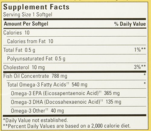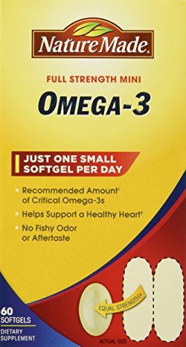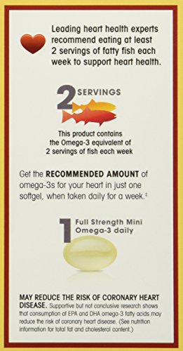 Just one small softgel per day. Recommended amount++ of key omega-3s. Helps support a healthy heart.+ No fishy odor or aftertaste.* Get the recommended amount of omega-3s for your heart in just one softgel, when taken daily for a week.++ Supportive but not conclusive research shows that consumption of EPA and DHA omega-3 fatty acids may reduce the risk of coronary heart disease (see nutrition information for total fat and cholesterol content). Nature Made Fish Oil supply comes from deep ocean waters. Our fish oil is not supplied from farm raised fish. State-of-the-art purification processes are used to remove PCBs, dioxins and furans, and mercury to ensure purity levels below 0.09 ppm, 2 ppt WHO TEQs and 0.1 ppm respectively. No color added. No artificial flavors, preservatives, yeast or starch. Gluten free. +This statement has not been evaluated by the Food and Drug Administration. This product is not intended to diagnose, treat, cure or prevent any disease. ++"Recommended amount" equates to a calculation based on approximately 3,500 mg of omega-3 fatty acids EPA & DHA found in two servings of fatty fish per week. *Enteric coated to reduce fish burps.