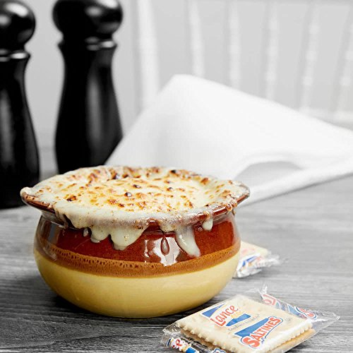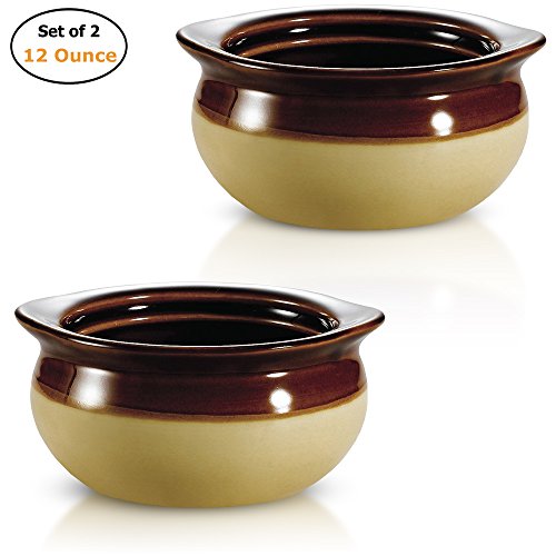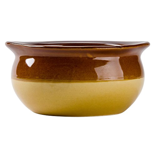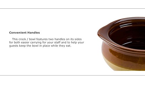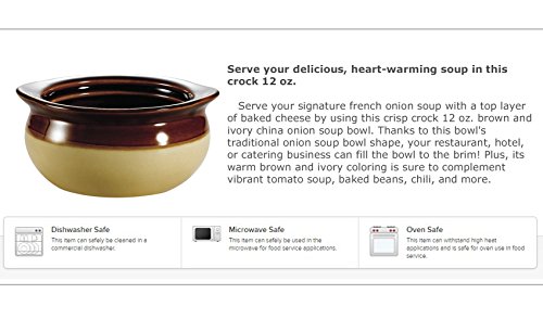 Product Description Serve your delicious, heart-warming soup in this Crock 12 oz. brown and ivory french onion soup crock / bowl! This set of 2 onion soup crocks are a great addition to any home or restaurant kitchen.Thanks to this bowl's traditional onion soup bowl shape, your restaurant, hotel, or catering business can fill the bowl to the brim! Plus, its warm brown and ivory coloring is sure to complement vibrant tomato soup, baked beans, chili, and more.