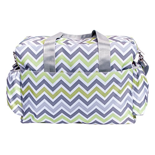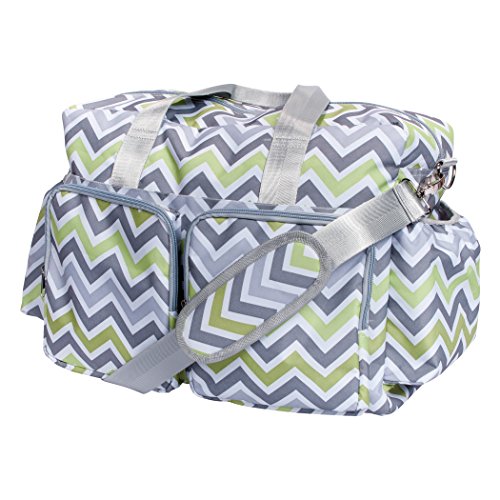 Form meets ultimate function and space with the Deluxe Duffle Diaper Bag by Trend Lab. The Deluxe Duffle is spacious enough for parents with multiple children and features several organizational pockets, a durable wipe-off exterior, sophisticated style, and extreme versatility. The Deluxe Duffle is made from durable black and gray chevron Polyester and has an attractive gray lining. Black top handle straps in addition to the black adjustable and removable shoulder strap allow for handy carrying versatility. Removable stroller straps can also be used for easy attachment to the stroller. Duffle features a zippered top closure with 4 spacious exterior zippered pockets, 2 exterior side bottle pockets, 6 interior organizational pockets, and an interior zippered pocket. Set includes a coordinating changing pad and a clear "dirty duds" zippered pouch.Feature