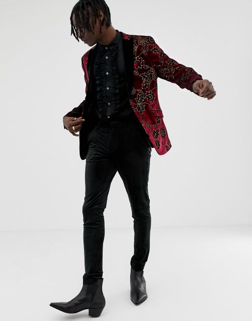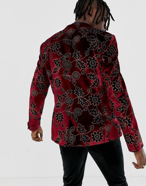 Heart & Dagger skinny fit blazer in burgundy floral velvet