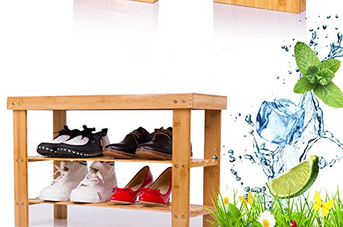 -. Feature : ENVIRONMENT FRIENDLY& STURDY: 100% natural bamboo, without formaldehyde; provides a more sophisticated look; / MULTIFUNCTIONAL: 2 tiers bamboo rack & storage bench for shoes,, bags, plants, toiletries, baskets in entryway, bedroom, bathroom, closet, etc. / ENOUGH SPACE & WE CAN SIT TO WEAR SHOES: Two-tier shelves, spacious enough for your daily wearing shoes, slatted shelves make shoes breathing from the gaps, preventing any odor; / EASY ASSEMBLY&DISASSEMBLY: Antirust and durable screws can be installed and disassembled repeatedly. / THOUGHTFUL WORKMANSHIP: Natural and smooth finish, rounded corners, protect your family from being scratched, especially the children;