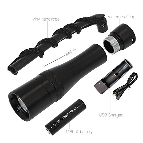 - What You Get: KC Fire Professional Scuba Diving Flashlight, 1* 18650 Rechargerable Battery, 1* Charger, 2* O-ring, 1 * Wrist strap and Our Friendly Service.