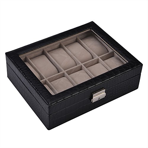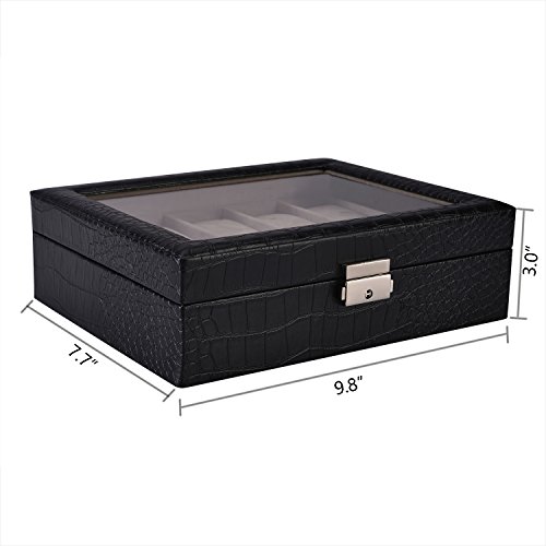 Metal lock, black premium PU leather, Real glass to enable easy viewing of the watches inside