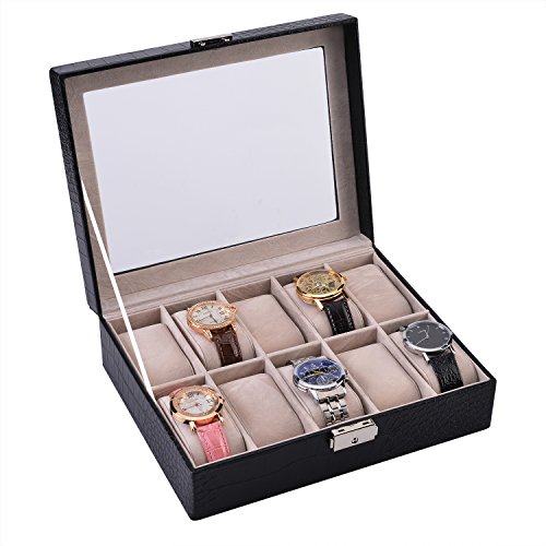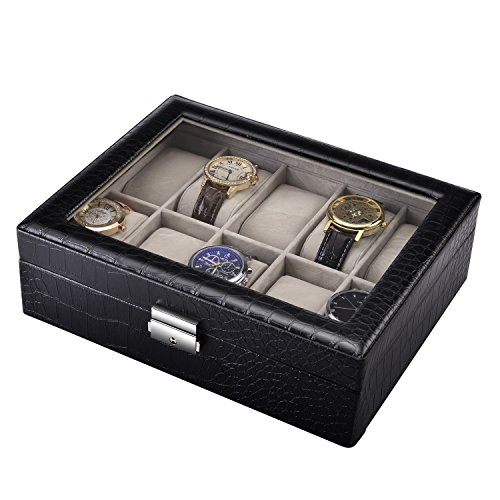 LOKHO Watch Box Display Case Organizer Storage with Glass Top Pu Leather Velvet Pillows Metal Lock