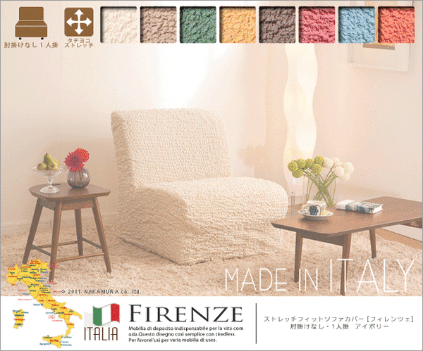 本商品はお取り寄せ商品のため、稀にご注文入れ違い等により欠品・遅延となる場合がございます。誠に恐れ入りますが、何卒ご了承ください。 また、以下の場合には追加送料がかかる場合がございます。  ・大型商品の複数購入時 ・同梱区分が異なる商品の複数購入時  【出荷目安】:3 - 6営業日 ※土日・祝除く 【同梱区分】:TS 1832 【梱包サイズ】:大型商品 【代引き決済】:不可  配送伝票の依頼主は出荷元(メーカーもしくは仕入元)名となる場合がございますので、お受け取りの際はご注意ください。   【型番】61000001  イタリア製ストレッチフィットソファカバー Firenze〔フィレンツェ〕アームなし 1人掛け用 ソファーカバー ストレッチ 1人掛け オレンジ   ≪アームなし・1人掛け用です≫ 商品について:どんな形にも合わせやすい!かぶせたら余った部分をソファのすき間に押し込むだけ♪タテヨコ伸縮自在のストレッチ素材。のびがよく柔らかで凹凸のある素材感が特徴。生地は上質なイタリア製。洗濯OK! 適合ソファサイズ:幅45~75cm・高さ85cmまで カラー:アイボリー・ブラウン・グリーン・イエロー・チョコレートブラウン・ワイン・ブルー・オレンジ 材質:綿55%・ポリエステル25%・アクリル15%・レーヨン5%(61000001)  【特記事項】 画像のカラー・サイズとは異なる場合がございます。商品名のカラー・サイズをご確認下さい。  【ご注意事項】 本商品は、北海道・沖縄・離島への配送はいたしかねます。あらかじめご了承ください。