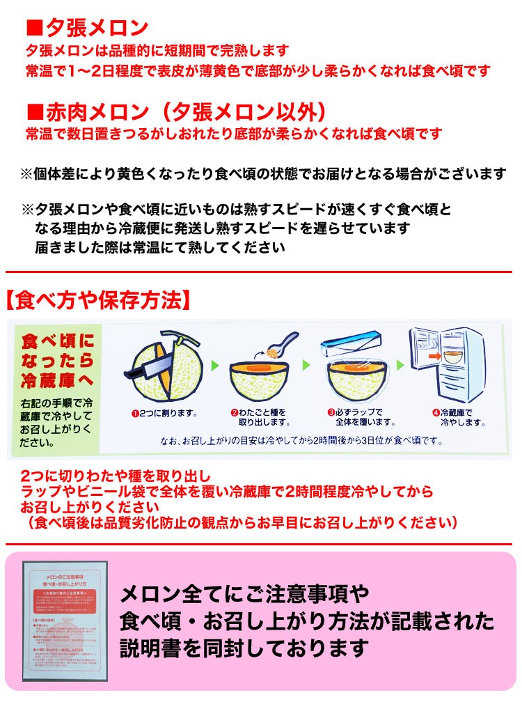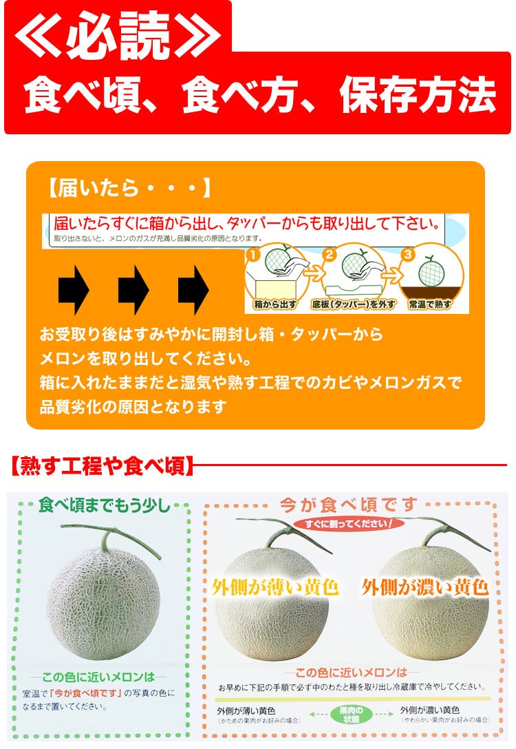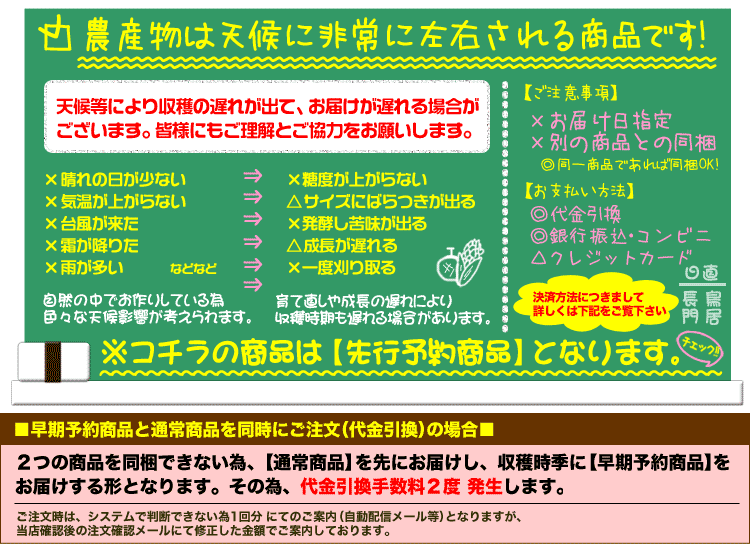 | 【2】万が一、天候・災害等の関係で生育や収穫に影響が生じた場合は ご注文をキャンセルさせて頂く事がございます (今までこういった事例はございませんが万が一を考慮し念のため記載させて頂きました) | 【3】この商品はご注文後にすぐ発注しますのでキャンセルが一切できません。 お客様のご都合(長期不在・受取辞退・宛先不明やその他)で商品が当店に戻ってきた際は ご購入商品代金+返送運送料をご請求させて頂きますのでご注意くださいませ。 ※ご贈答品で自分以外にお届けする場合は、予め商品の受取困難な日を把握し ご注文時に備考欄にご明記ください。ご自宅へ配送の場合も同様にお願いします。 ご記入頂きましたら、なるべくご要望にお応えできるようご対応いたします。 | | 【4】この商品は重量ベースでの販売となる為、玉数のご指定はお受けできません。 | | 【5】個体差等の関係で熟されて食べ頃の状態でお届けとなる場合がございます | 【送料及び発送形態について】 この商品は冷蔵便・収獲の都度発送の為、この商品以外の同梱(1梱包発送)は不可です。 尚、この商品を複数注文の場合は同梱可能です。 もし他商品と同時ご注文の場合『別便発送』の為、別途送料が必要な場合がございます。 その場合、ご注文決済画面ではシステム上送料が加算されませんが、 後程、当店がその分の送料を計上して客様へご案内メールをお送り致します。 | 以上、季節物で生物の理由から何卒ご協力をお願い申し上げます。m( _ _ )m |