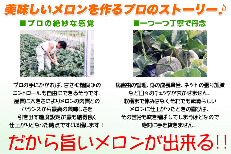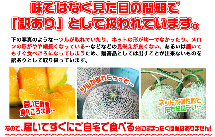 日本メロン界屈指のトップブランド 寒暖差が厳しい北海道の大地であま~く育った 赤肉メロンを果物のプロが厳選してお届け 優しい口当たりとまろやかな後味が特徴的です シーズン中の暑い日は半冷凍などキンキンに冷やして豪快に 【訳あり理由】不揃い・変形・傷・ツル無し、等 ある程度熟した状態でお届けする場合がある訳あり品です