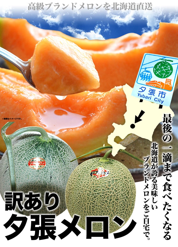 ≪クーポン発行中≫2個ご注文で1,000円OFF(1個あたり500円OFF)クーポン有効期間は発行から10~15日ですクーポン有効期間中は1ユーザー2回(2枚)のみご利用可能ですクーポン適応は一度のご注文に2個ご注文の場合に適応されます訳あり夕張メロン(不揃い・変形・傷・ツル無し、等)■原産地:北海道産■内容量:約4kg前後(約2~4玉前後)※重量ベース販売の為玉数は選べません。■保存方法届いたらすぐに箱から出し、タッパーからも取り出して下さい。※メロンのガスが充満し品質劣化の原因となります■メロンの底を押上げて弾力を感じたら食べ頃です冷蔵庫で冷やして召し上がり下さい■約3~4人前■物によっては食べ頃な状態で届く場合がありますこの商品は変形・ツル無し・サイズのバラつき等がある訳あり品のため贈答用には向きません商品の特性上、時期によってはヘタ部分にカビつく場合がありますが商品には問題ございません輸送上破損を防ぐ為に運送会社がメロンと箱に記載する場合がございます。訳あり品のためメロンが入る箱は簡易的なものとなります■発送形態:冷蔵発送