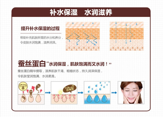 Benefits: This cleanser is easy absorb by the skin, using natural ecology silk cocoon, supply nutrition for the skin, deep moist water lock.