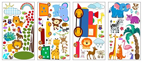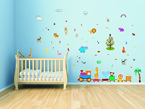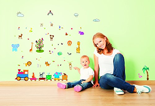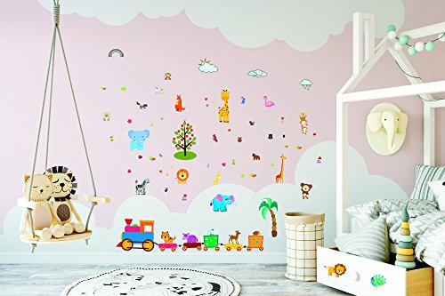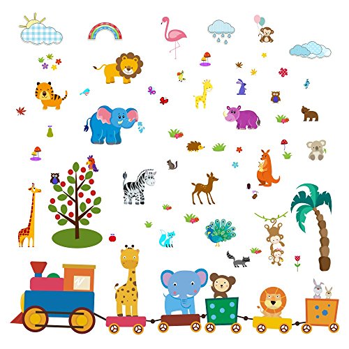 Baby Jungle Animal Wall Decals for Nursery: Multiple Decorative Peel and Stick Animal Train Removable Art Mural, Safari Animal Vinyl Stickers for Baby, Nursery...