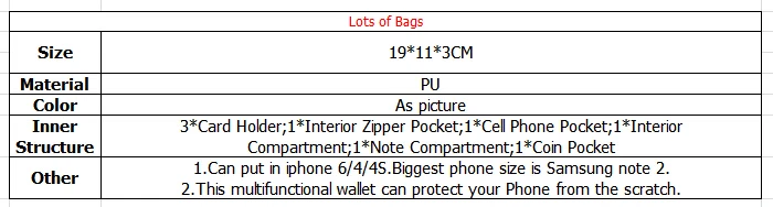 Interior:Interior Compartment,Interior Key Chain Holder,Zipper Poucht,Cell Phone Pocket,Interior Zipper Pocket,Passcard Pocket,Coin Pocket,Photo Holder,Interior Slot Pocket,Note Compartment,Card Holder