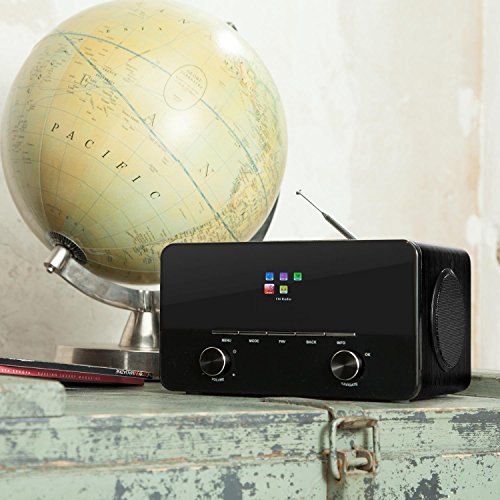 Features: ? Connections: 1 x RJ-45 LAN port, 1 x USB port, 1 x 3.5mm jack AUX input, 1 x 3.5mm jack line-out, 1 x 3.5mm jack headphone?out ? Supported file formats: MP3, WMA, FLAC; AAC, AAC ? 2 x 3 Watt 1 x 14 Watt RMS ? 802.11 a / b / g / n ? 10/100 Ethernet ? UPnP and DLNA streaming support ? Frequency response: 23 Hz - 21 kHz ( /- 3dB) ? Equaliser presets: Normal, Middle, Jazz, Rock, Soundtrack, Classical, Pop, News, Custom ? 2-band equaliser with selectable loudness function ? Simple operation via multi-function knobs ? Multilingual menu (German, Italian, French, Spanish, etc.). ? Alarm via Summerton, internet radio and FM ? Music player with adjustable playlist, repeat and random play ? Dimmable display backlight ? Time and date display ? Automatic time synchronisation via internet ? Mute ? DRC function ? Setup wizard ? Updatable software ? Telescopic antenna ? Grip volume and navigation controller out of?metal ? On / off switch on the rear panel ? Power remote control: 1 x CR2025 battery ? Power supply: DC 12V, 2A (AC adapter included)