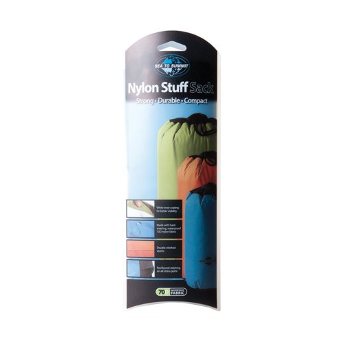 Studio : Sea to Summit Publisher : Sea to Summit Product Description Sea to Summit Seam Sealed Stuff Sacks feature all the things you'd want in a stuff sack. The 70-denier, 10,000 mm waterhead rated nylon we use is the ultimate in storm proof fabric for stuff sacks. Not only is it super strong and lightweight, but is waterproof to give you added protection from light rain, snow or soggy pack fabric. They've got a handy Hypalon® clip-in loop and an ingenious single-hand operation draw cord closure. Like its Dry Sacks, the lining is white so you can more easily identify the contents of each sack. 0