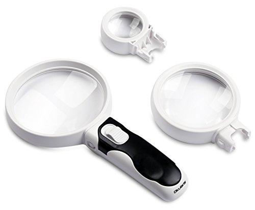 [Product Information]- The Okularis® LED-Illuminated Magnifying Glass features three interchangeable lenses (2.5x, 5x, 16x) that each provides clear, distortion-free, handheld magnification.