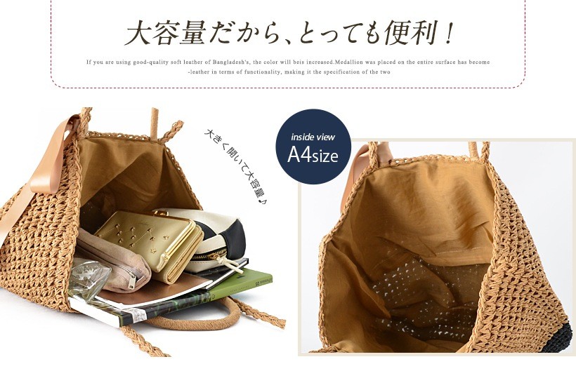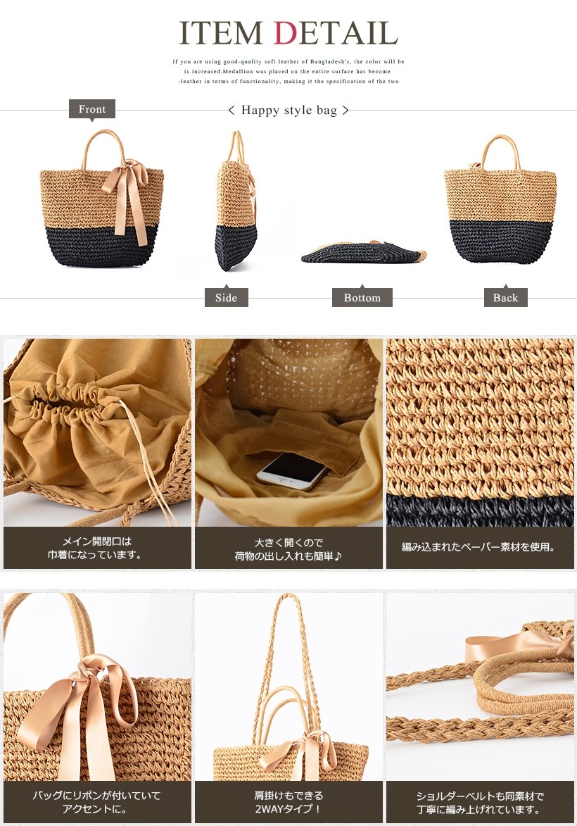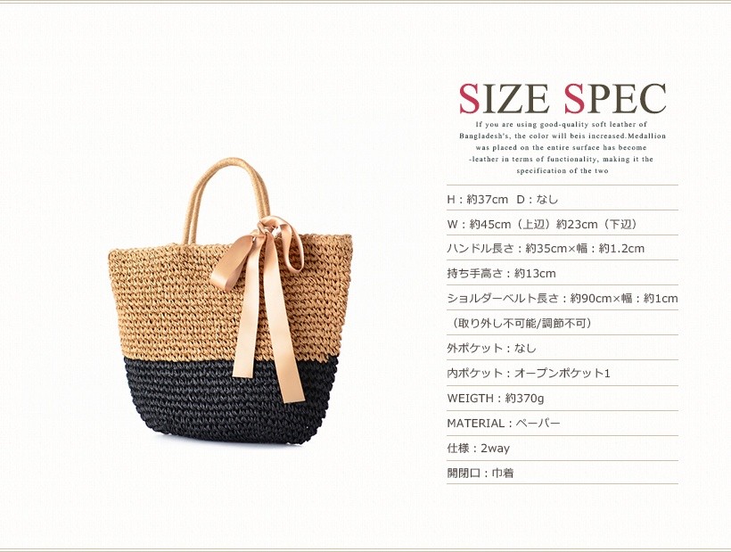●SIZE:高さ:約37cm / 幅:約45cm(上辺)約23cm(下辺) / マチ:なし●ハンドル長さ:約35cm×幅:約1.2cm、持ち手高さ:約13cm●ショルダーベルト長さ:約90cm×幅:約1cm(取り外し不可能/調節不可)●外ポケット:なし●内ポケット:オープンポケット1●素材:ペーパー●重さ:370g●仕様:2way●バッグのメイン開閉口は巾着タイプになっております。[カラー]ベージュ・ベージュブラック