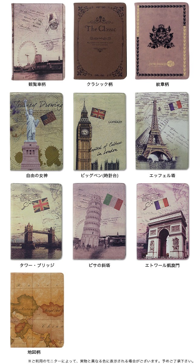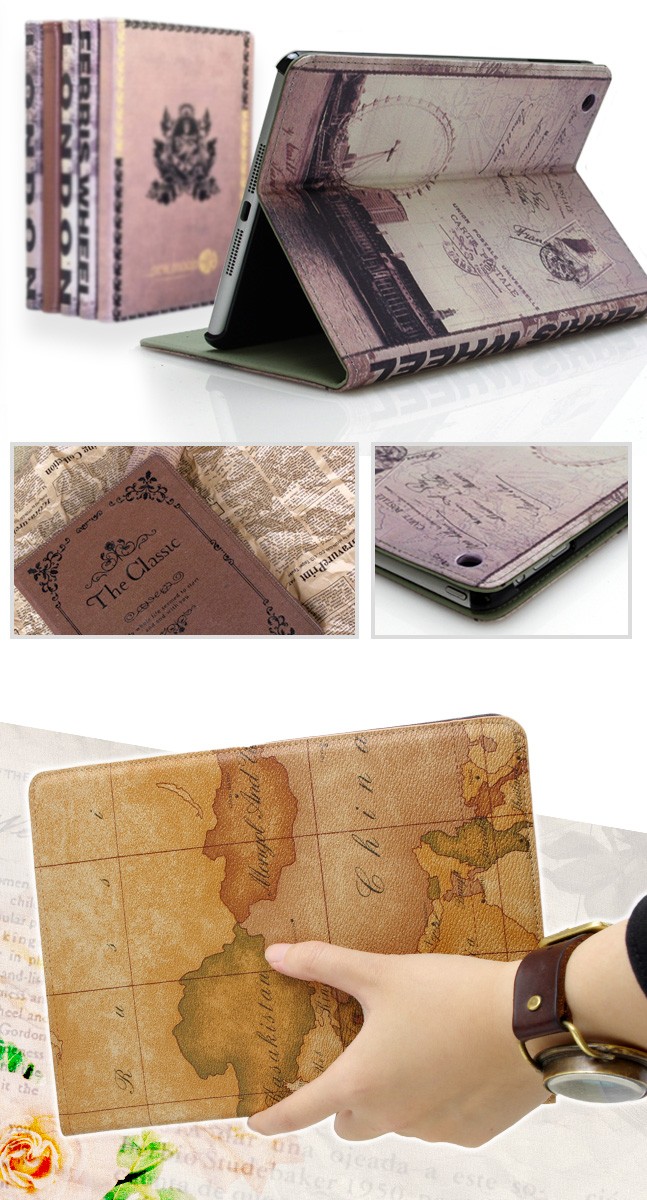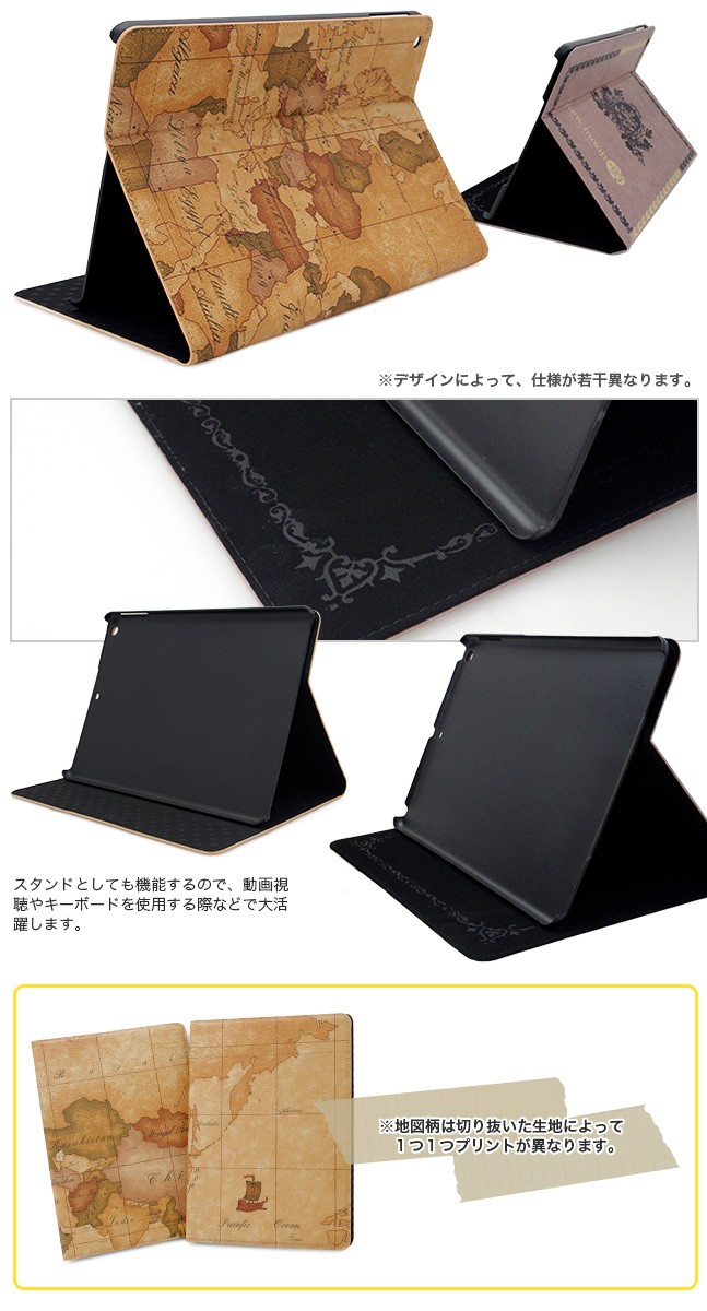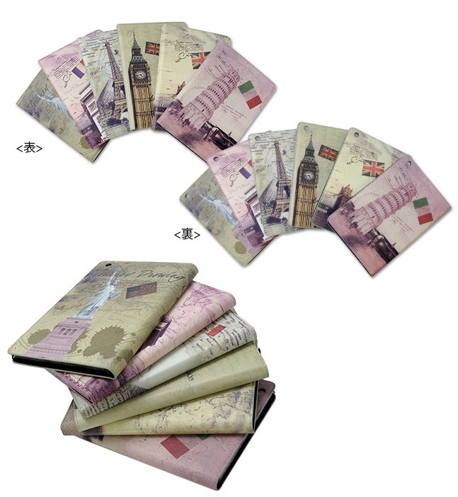 | 仕様 | ビンテージ感たっぷりの洋書を開いているかのよう… アンティークなデザインがオシャレな iPadmini用ケースです。 ブックデザイン、または有名な観光地の写真をコラージュしたようなデザインで周りからも大注目。 フリップ部分を折ればスタンドにも早変わり。 おしゃれだけでなく機能性も抜群です。 |