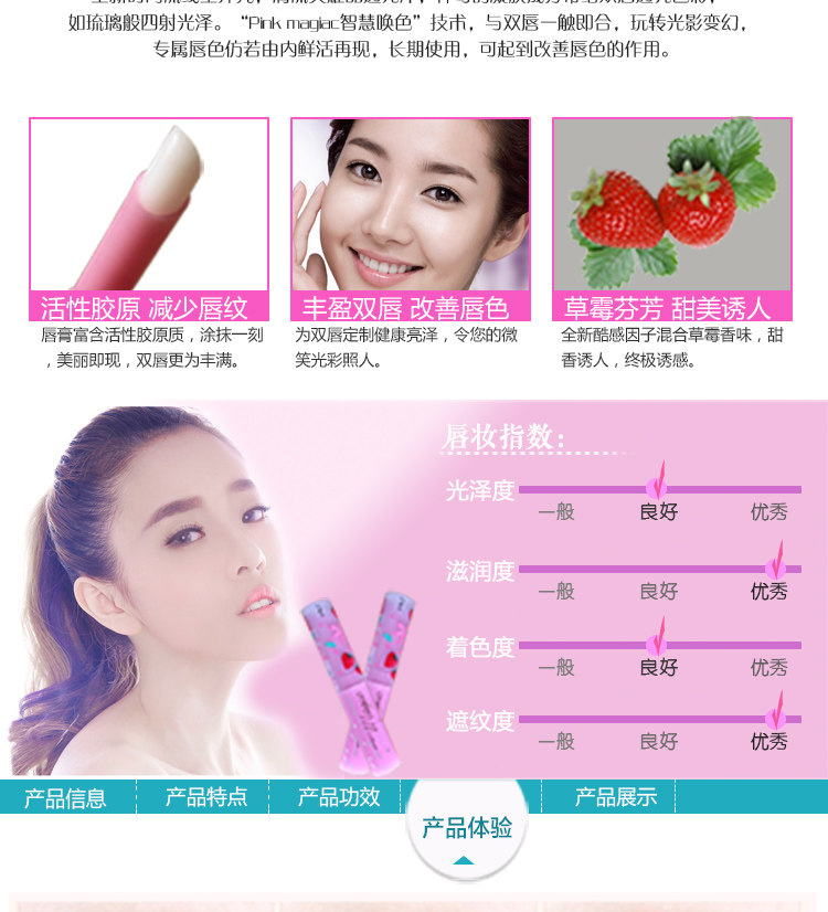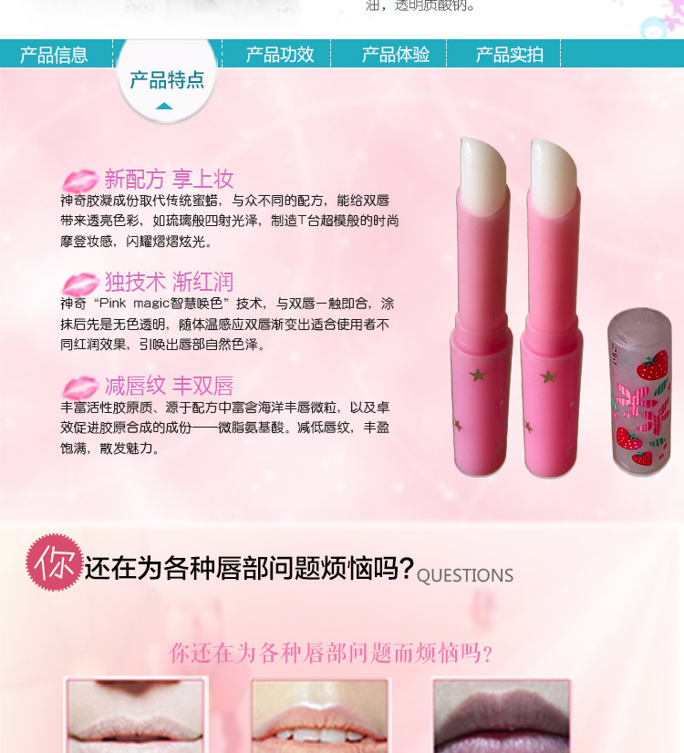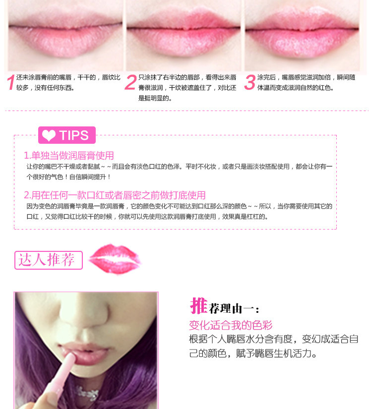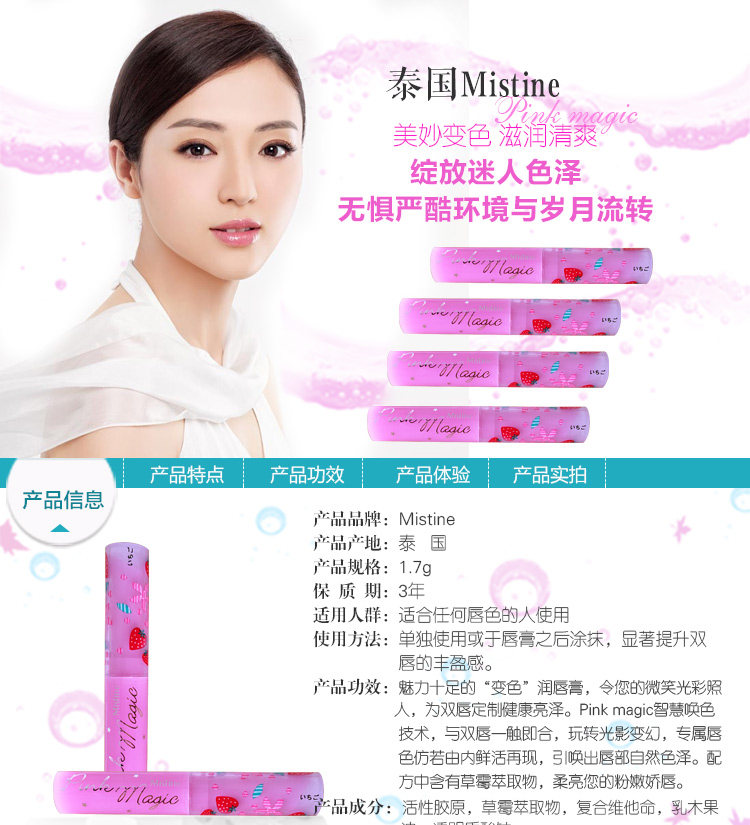 此款Mistine唇膏具有保湿滋润,时尚色泽,持久不掉色!!擦上唇后开始变色,当真是奇妙的粉色魔法!自然的粉嫩,对嘴唇的呵护很重要哦~
