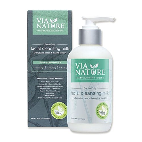 -. Feature : Via Nature - Gentle Daily Facial Cleansing Milk 6floz / he triple action cleanser: moisturizes, exfoliates and leaves your skin cleansed. / Omega 6 & 9 Essential Lipids , Organic Chamomile Flower Extract , Organic Olive Leaf Extract 5. Organic Witch Hazel Extract , Calendula , Marine Extract , 100% Natural Wax Jojoba Beads / Sensitive Dry Skin / Gentle Daily Facial Cleansing Milk