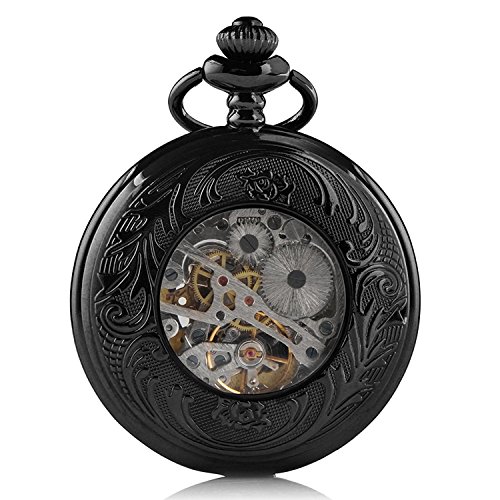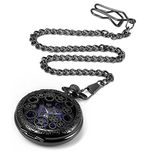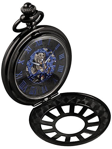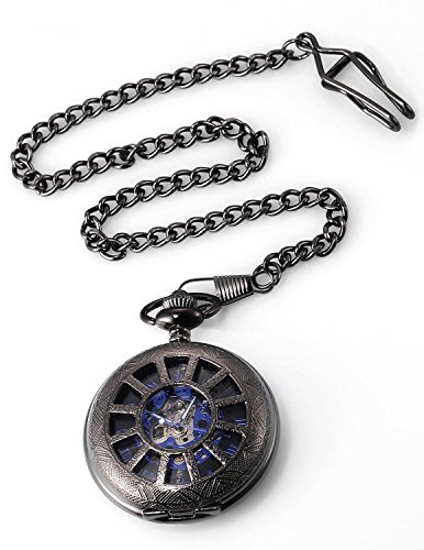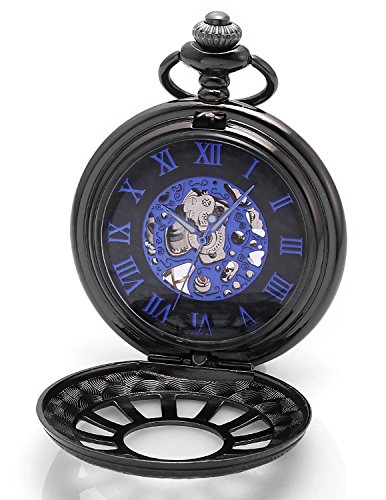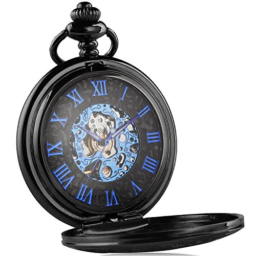 -. Title : Carrie Hughes Steampunk Blue Hands Roman letters Skeleton Mechanical Pocket Watch with Chain for Men Women