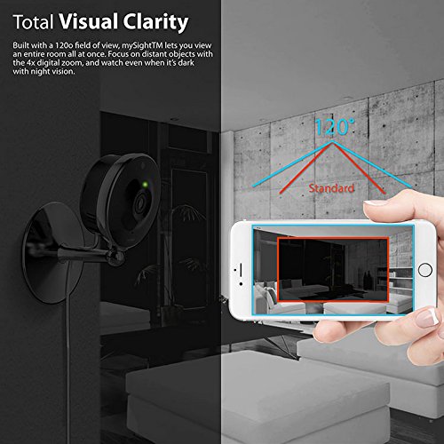 -. Feature : Watch your home or business in 2K (2048 x 1080) resolution HD video / Total visual clarity 150-degree field of view, 4x digital zoom, night vision / Use as a baby monitor and communicate through two-way audio / Access mySight remotely from any device 24-7; intelligent alerts and notifications on your mobile device / Includes: mySight 2K Camera, metallic stand, wall mount, 10 ft (3m) micro-USB charge cable, AC adapter, Quick Start Guide
