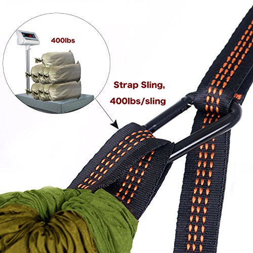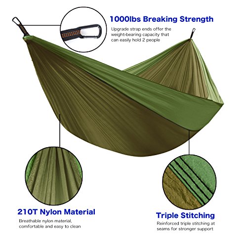 DOUBLE HAMMOCK WITH TREE STRAPS: All gears are in one bag. Come with everything you need: double size camping hammock, solid steel carabiners and 3 meters tree straps. The ends of hammock have been upgraded to stronger nylon strap. All design makes setting up hammock easier and safer than ever before