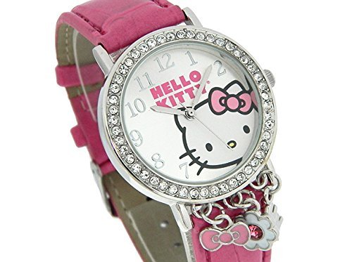 Snazzy for the perfect wrist. This easy to read analog watch face features Hello Kitty with a pink bow on her hair. The brand is made of leather and has 3 hanging charms.