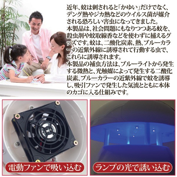 近年、蚊は刺されると「かゆい」だけでなく、デング熱やジカ熱などのウイルス菌が媒介される恐ろしい害虫になってきました。本製品は、社会問題にもなりつつある蚊を、殺虫剤や蚊取線香などを使わずに捕えるグッズです。蚊は、二酸化炭素、熱、ブルーカラーの近紫外線に誘導されて行動する虫で、これらに誘導されます。本製品の補虫方法は、ブルーライトから発生する微熱と、光触媒によって発生する二酸化炭素、ブルーカラーの近紫外線で蚊を誘導し、吸引ファンで発生した気流とともに本体のカゴに入る仕組みです。蚊はカゴから逃げ出せずに風化死滅します。カゴは簡単に取り外しできます。家庭用電源でもUBSポートでも使用できます。