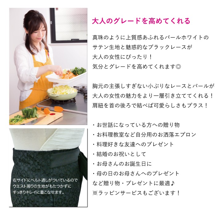 まるで真珠のような上質感ある人気のサテン生地と、 魅惑的なブラックレースは、 大人のグレードを高めてくれるおしゃれなドレスエプロンです。 ■サイズ フリー 着丈(胸元から裾まで) : 約76cm  ウエスト : 約81cm 腰紐(片側) : 約92cm ■材 質 胸部:ポリエステル100% スカート表地:ポリアミド100% 裏地:ポリエステル100% 帯:ポリエステル100%