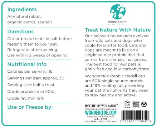 -. Feature : Natural rabbit, carrots, and sea salt make a healthy and delicious treat for your pet / Grain-free, hormone-free, antibiotic-free, pesticide-free, and preservative-free / These treats are made like all Wondercide products - by hand, in small batches, with lots of love and care in the USA! / Our treats contain real meat from the same supplier Whole Foods uses / Great for cats and dogs of all ages