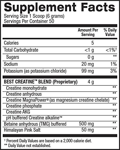 ReleaseDate : 2015-11-07 Studio : BPI Sports Publisher : BPI Sports Binding : Health and Beauty Product Description Creatine is a nutrient that occurs naturally in the body and in some foods. It functions as an energy source in your muscle cells, helping improve muscular output and reduce fatigue during rigorous physical exertion. BEST CREATINE powder makes supplementing with creatine effortless by combining several forms of creatine to help you build more strength and increase lean muscle. However, not just any creatine. We’ve combined the 6 top forms of creatine, including the most heavily researched, Creatine Monohydrate, to give you the most advanced and effective creatine formula possible. BEST CREATINE has been designed to increase strength, muscle growth, performance and recovery. Not to mention no loading and no bloating. 0