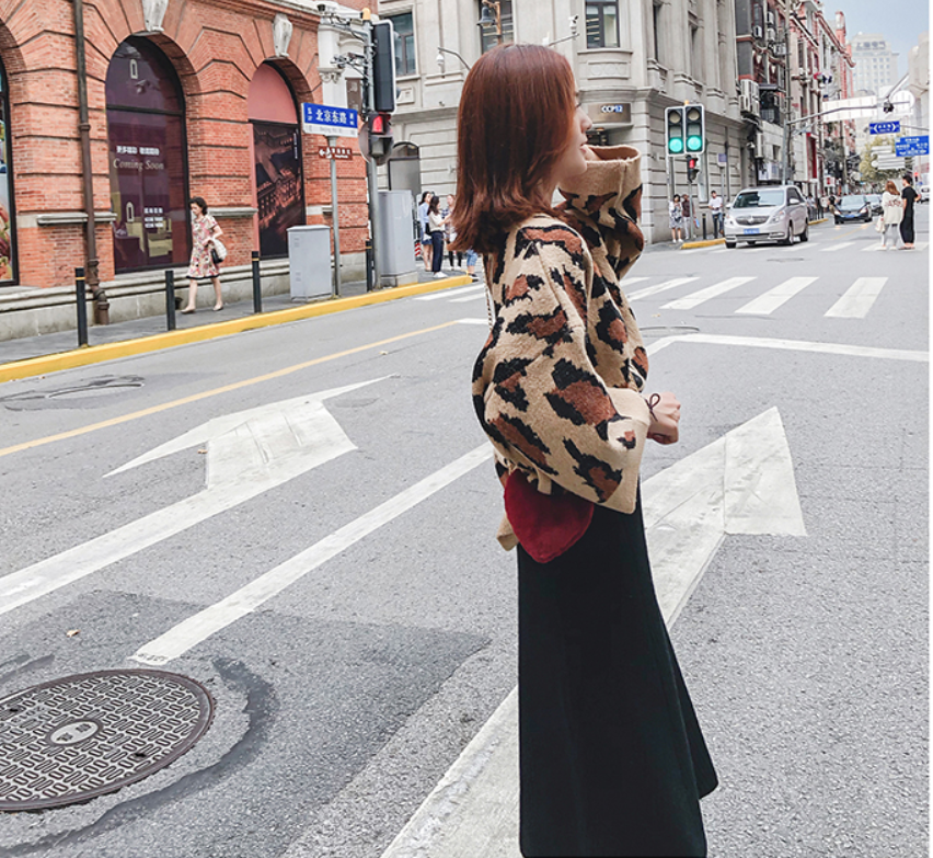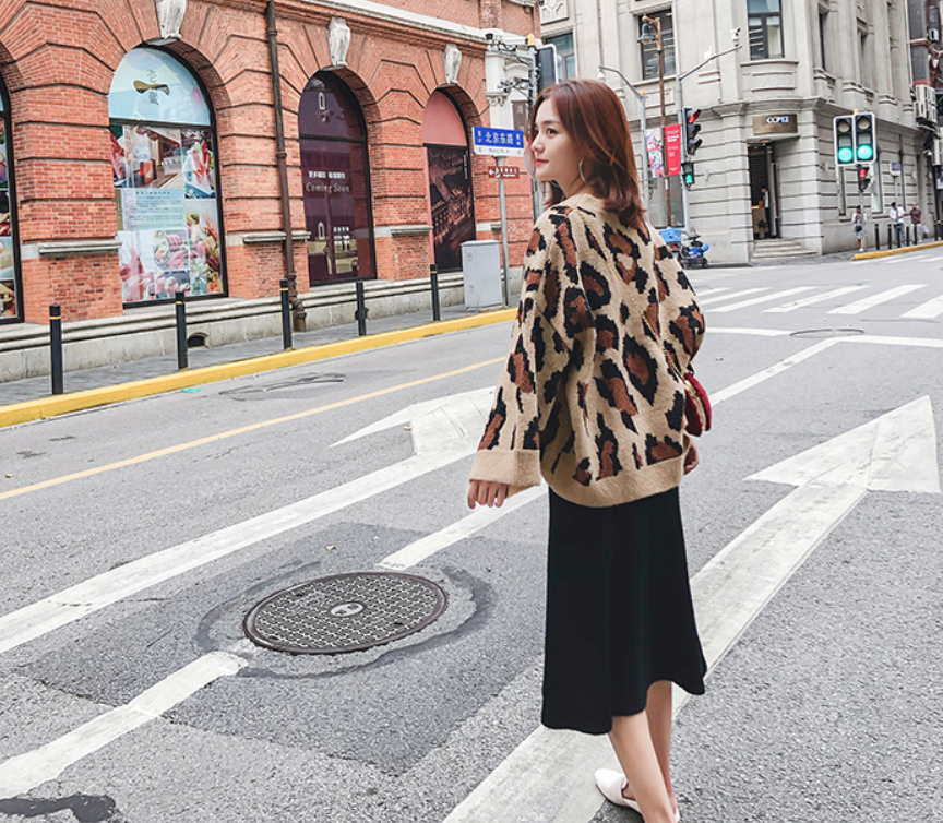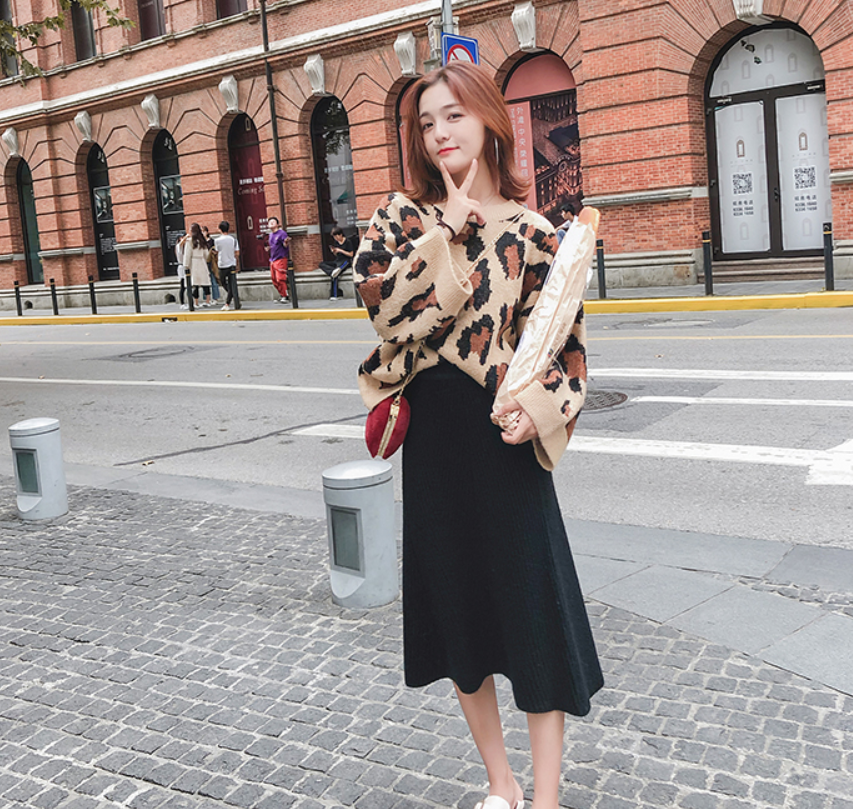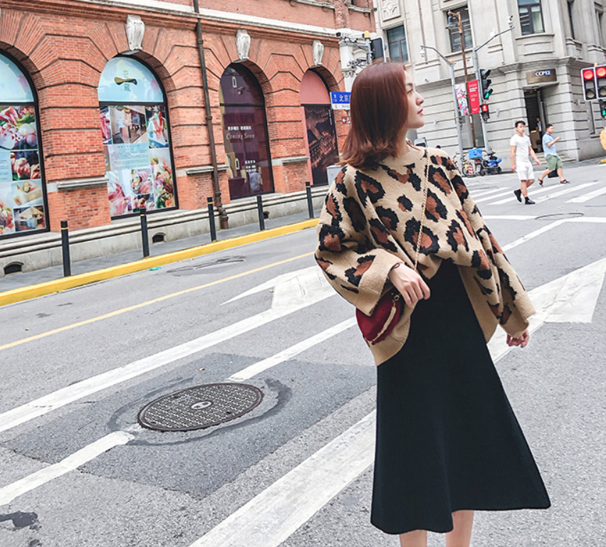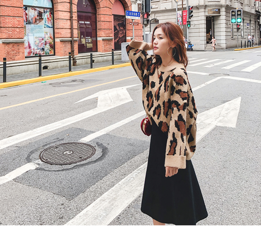 丸首でスッキリしたヒョウ柄のセーター