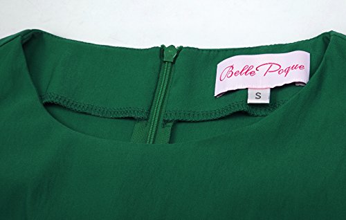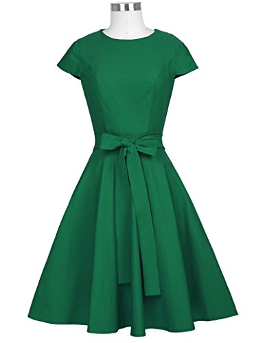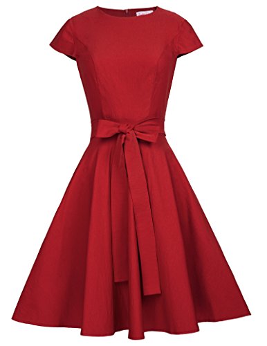1950s Vintage Dress, Cap Sleeve, Crew Neck, Swing Hemline, Fit and Flare, Solid Color, Waistline is adorned by fixed belt