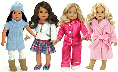 -. Feature : 18 Inch Doll Fall/Winter Wardrobe / Pink and Teal Plaid Skirt with Long Sleeve Shirt, Pink Fur Trimmed Sweatshirt and Pink Sequin Boots / Blue Short Sleve Sweater Dress with Hat and Snowflake Leggings and Tan Boots / Hot Pink Satin PJs, Soft Pink Robe and White Fluffy Slippers / 12 Piece Sets by Sophia's Designed in the USA. Made by Sophia's, leading doll clothes and accessory maker!