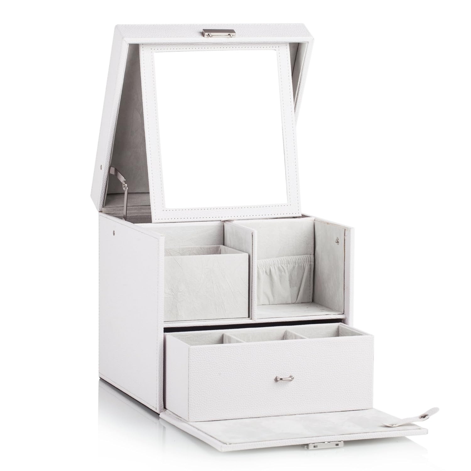 1.サイズ:長さ23cm幅23cm高さ23.5cm・約2.1kg 2.材質: 表面材=輸入PU 内側=フロッキング 中芯= MDF繊維板 3.ふたを開けて前面扉を開くと、アイテムが取り出しやすい 4.いつもの持ち物キレイにまとめて一目瞭然! 毎日使う大切なものをまとめて収納。 5.フェイクレザー生地にステッチでカジュアル感をプラスした、ミラー付きコスメボックスは、取っ手付きなので持ち運びにも便利。