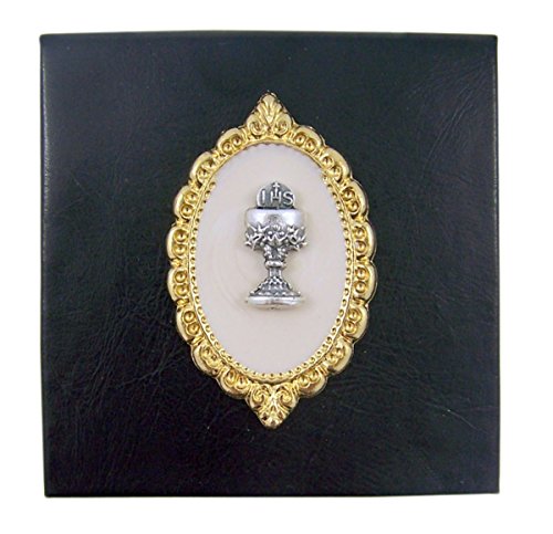 First Holy Communion IHS Chalice Plaque Black Leather Rosary Box, 2 5/8 Inch