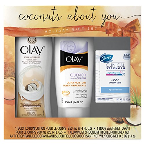 -. Feature : Olay Ultra Moisture Body Wash Coconut Oasis contains a jar of Olay moisturizers to improve skin condition over time. / Olay Quench Ultra Moisture Body Lotion. With continued use, skin becomes noticeably soft and smooth. / Secret Clinical Strength Antiperspirant provides 4X the protection against stress sweat vs. the wetness protection required of an ordinary antiperspirant. / Holiday Gift Set