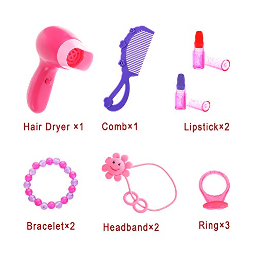 Cute make up set will keep girls hours of pretend play fun with fashion and makeup accessories. Including real working hair dryer, bracelets, rings, lipsticks, cosmetic bottles, hair band, comb. Great for alone or group play!
