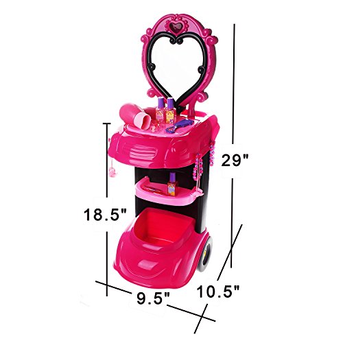 The kid-sized dresser playset features trolley design with 2 big wheels, easy to push and pull everywhere around house. It has enough storage space for pretend play accessories and keep playroom neat and organized. Dimension after assembly: 9.5"(L)*10.5"(W)*29(H)
