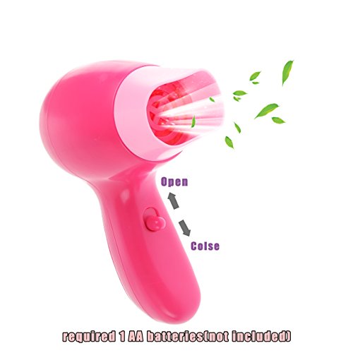 The pink hair dryer will blow soft wind when you turn on the switch. The mirror will show flashing lights and fantastic sounds when press the heart-shaped button, requires 1 AA battery(not included).