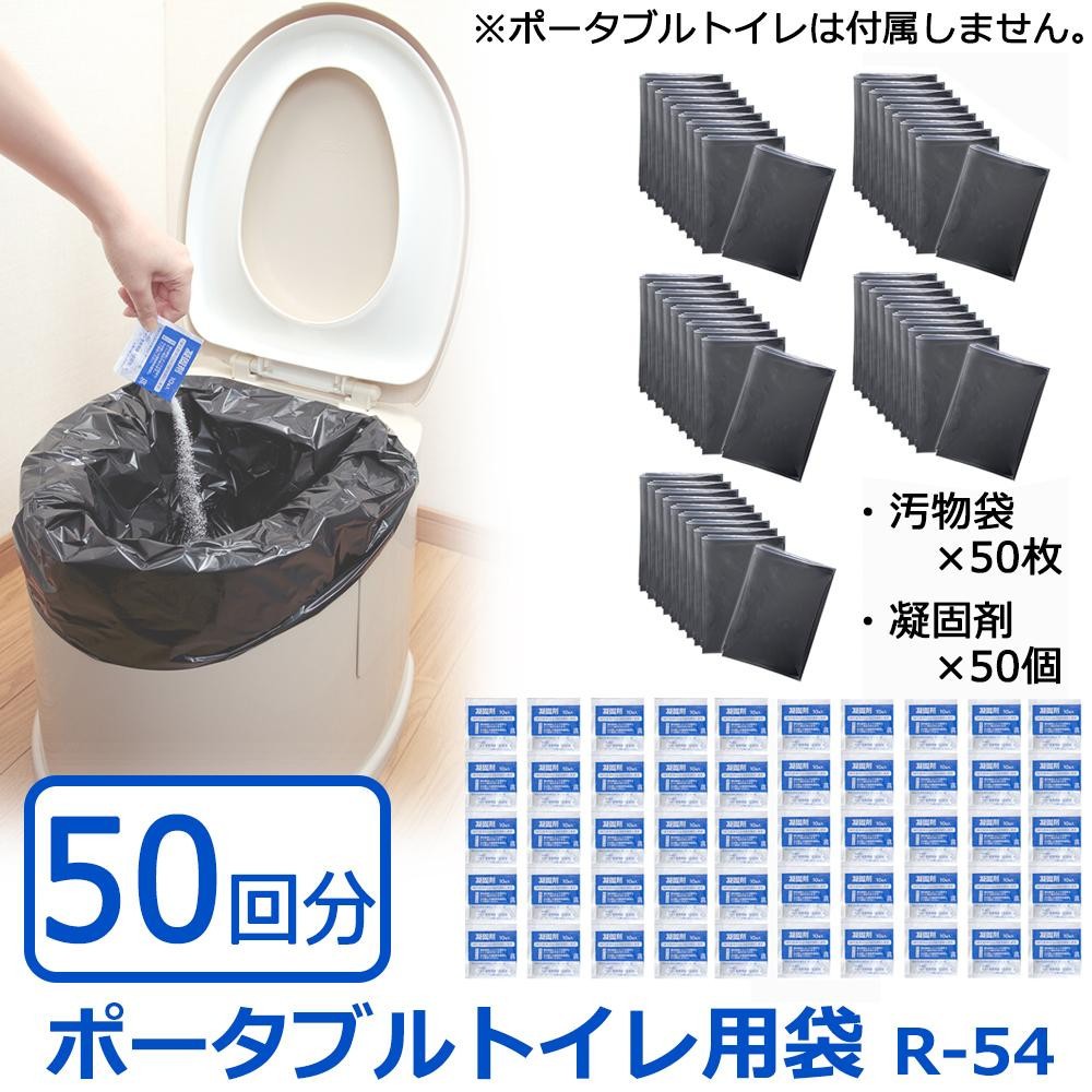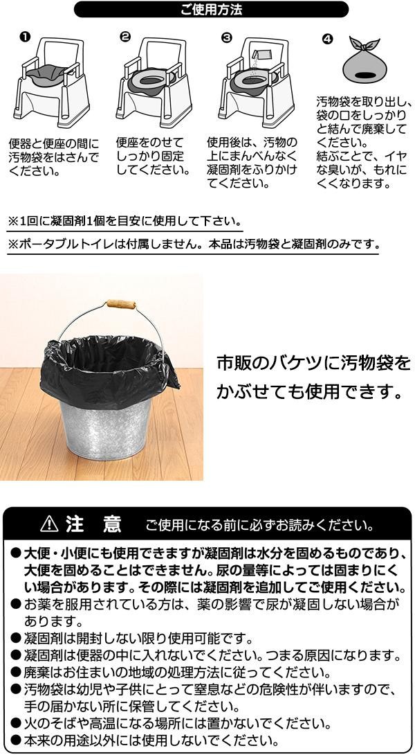 別売のポータブルトイレに汚物袋をかぶせるだけで、用を足すことができます。汚物袋と凝固剤が50回分セットになっています。
