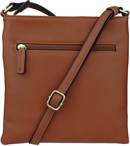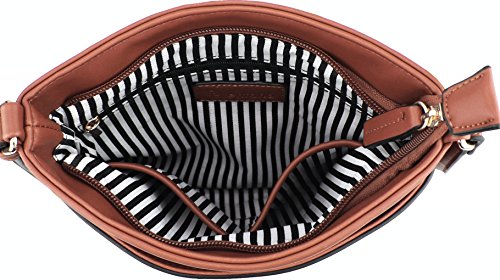 Fashion crossbody handbag that is made with faux leather with a black and white striped fabric lining. The purse is lightweight and incredibly comfortable to use on an everyday basis. It has a zipper closure at the top and a pocket with magnetic clasp closure at the front and a zipper pocket at the back. There are two pockets in the lining and a zipper pocket inside of the purse.