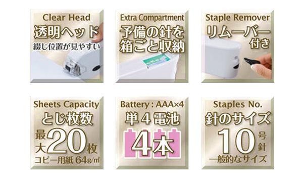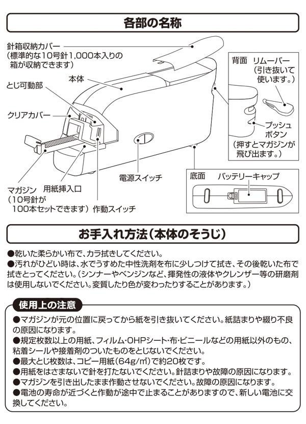 | 仕様 | 使用針:10号(JIS)(別売) 最大針装填数:100本 とじ枚数:最大約20枚(コピー用紙64g/m2) 電源:単4乾電池×4本(別売) とじ奥行き:10mm リムーバー付き |