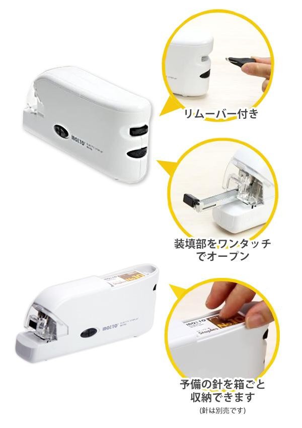 綴じ口に紙を入れるだけで自動で綴じる電動ステープラーです。綴じ位置が見やすい透明ヘッドに、斜め綴じもできるガイド付き。針を平らに綴じるフラットクリンチ仕様で書類もかさばりません。本体に予備の針を箱ごと収納できます。 |