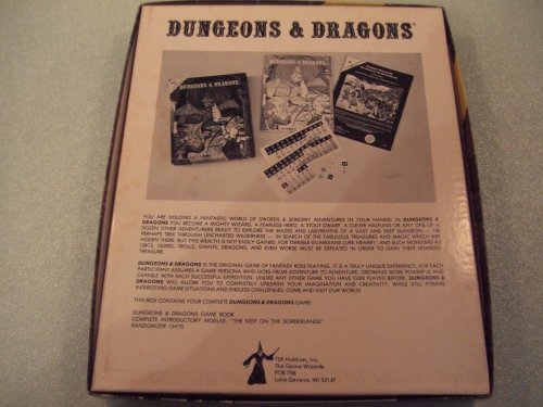 -. Binding : Toy -. Brand : Dungeons & Dragons -. Feature : Introductory game set designed to teach the fundementals of role playing & D&D / Multiple editions of this kit were printed from 1975 to 1981 / Includes basis D&D rules, an intro adventure, and a more comprehensive adventure with much of the work already done -. Label : TSR Games -. Manufacturer : TSR Games -. Model : 1001 -. MPN : TSR-1001 -. PartNumber : TSR-1001 -. ProductGroup : Toy -. ProductTypeName : TOYS_AND_GAMES -. Publisher : TSR Games -. Studio : TSR Games -. Title : Tsr Dungeons & Dragons 1980 Basic Set